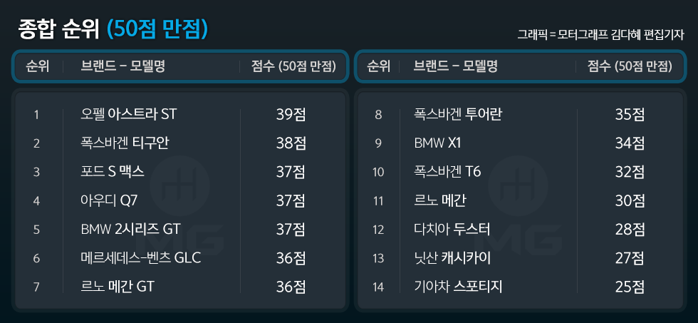 이번 테스트에서 종합 순위 1위(50점 만점)는 39점을 받은 오펠 아스트라 ST가 차지했습니다. 폭스바겐 티구안은 38점으로 2위에 올랐는데요. 동급 경쟁 모델임을 감안하면 25점으로 최하위를 기록한 스포티지의 성적이 얼마나 나쁜 것인지 알 수 있습니다. 다음으로는 포드 S맥스(37점), 아우디 Q7(37점), BMW 2시리즈 GT(37점), 메르세데스 GLC(36점), 르노 메간 GT(36점), 폭스바겐 투어란(35점), BMW X1(34점), 폭스바겐 T6(32점), 르노 메간(30점), 다치아 두스터(28점), 닛산 캐시카이(27점) 순으로 나타났습니다.