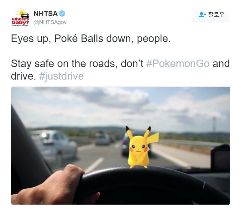 NHTSA는 “눈은 위로(전방주시), 포켓몬GO는 아래로”라는 짤막한 글을 올렸다. 또, 도로에서는 운전에만 집중해 달라고 호소했다. 여기에 게임 캐릭터 피카추가 스티어링 휠 위에서 시야를 방해하는 이미지도 함께 첨부했다.