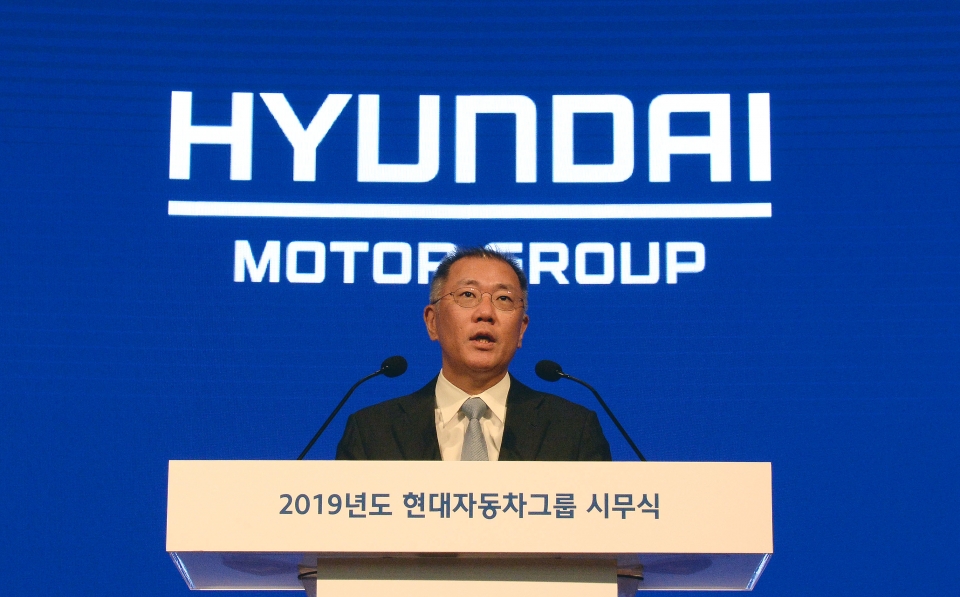 이날 시무식을 주재한 정의선 수석부회장은 "지금까지의 성장방식에서 벗어나 우리 역량을 한데 모으고 미래를 향한 행보를 가속화해 새로운 성장을 도모해야 할 때"라며 "미래 분야에 대한 투자를 지속적으로 확대해 4차산업 혁명 시대를 주도해 나가겠다. 조직의 생각하는 방식, 일하는 방식에서도 변화와 혁신을 추진하겠다"고 말했다.