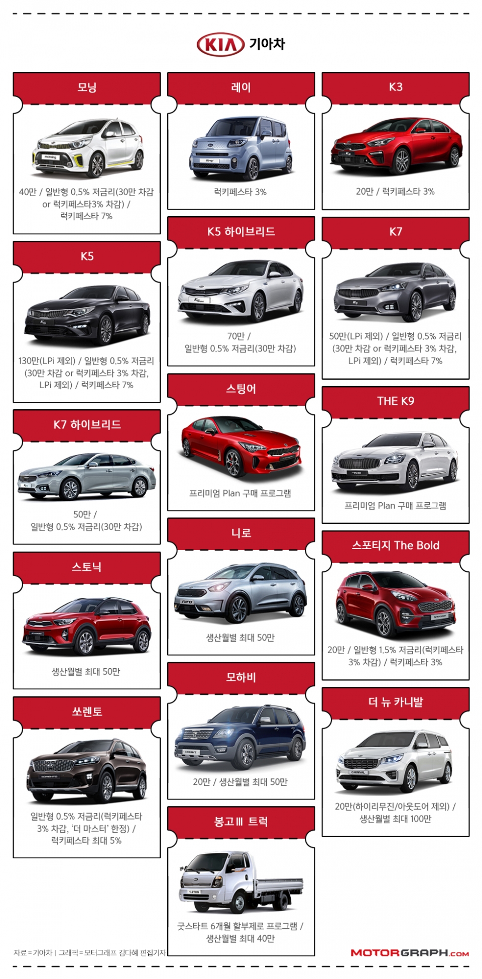 럭키 페스타와 별개로 차종별로 ▲K5 130만원 ▲K5 하이브리드 70만원 ▲K7 50만원(하이브리드 동일) ▲모닝 40만원 ▲K3 20만원 ▲스포티지 20만원 ▲모하비 20만원 ▲카니발 20만원 등 할인이 진행된다.
