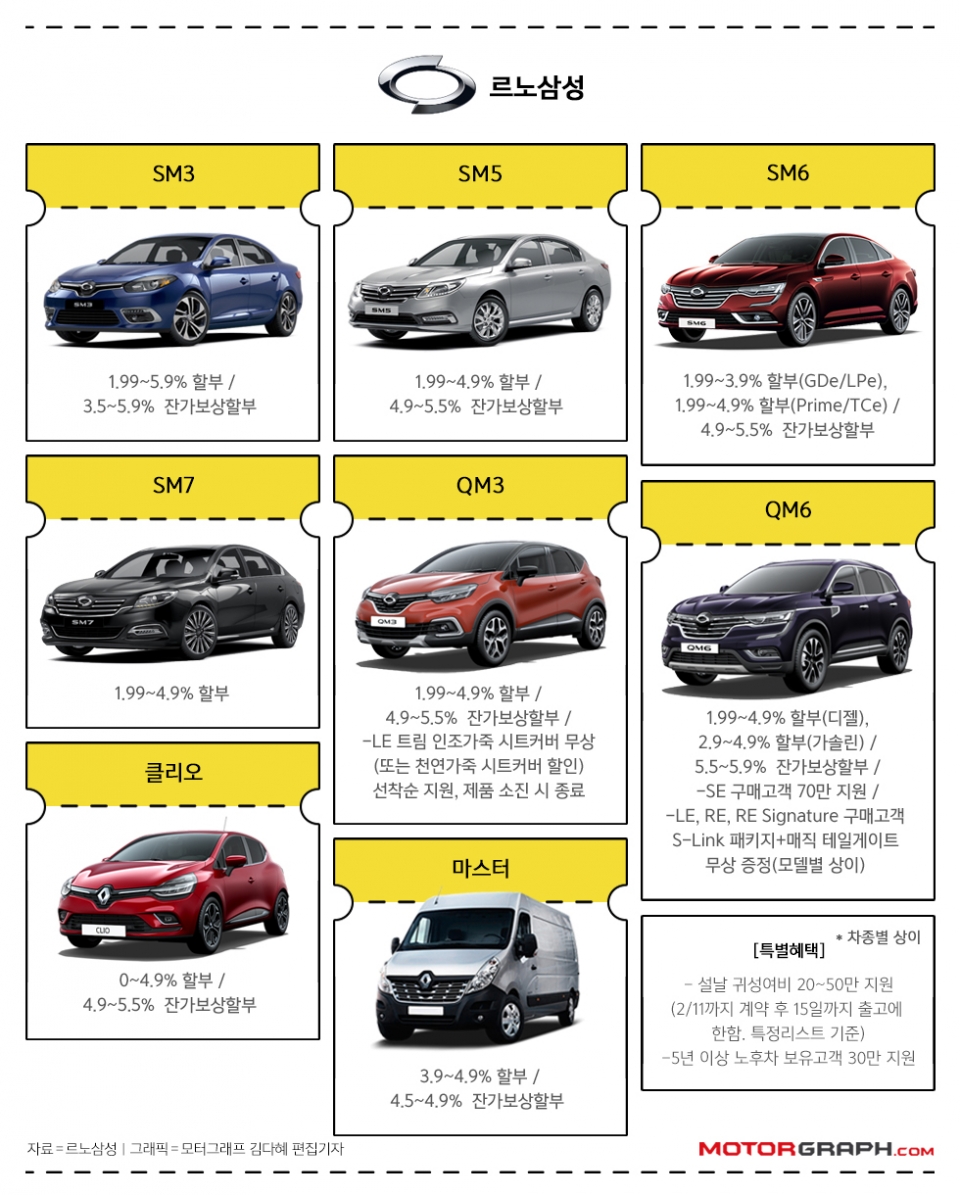 르노삼성은 설 명절을 맞아 2월 신차 구입 고객에게 차종별로 최대 50만원 귀성비를 마련했다(▲SM6 50만원 ▲QM3 클리오 30만원 ▲SM3·SM5·SM7·QM6 디젤 20만원).