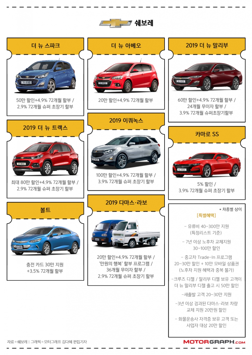 이어 7년 이상 노후차 교체 지원 프로그램인 '쉐보레 익스체인지'를 확대 운영한다. 이를 통해 ▲스파크 30만원 ▲말리부·트랙스 50만원 ▲이쿼녹스 100만원의 특별 할인을 추가 제공한다. 3년 이상이 경과된 다마스 및 라보 보유 고객에게는 추가 20만원 혜택을 마련했다.