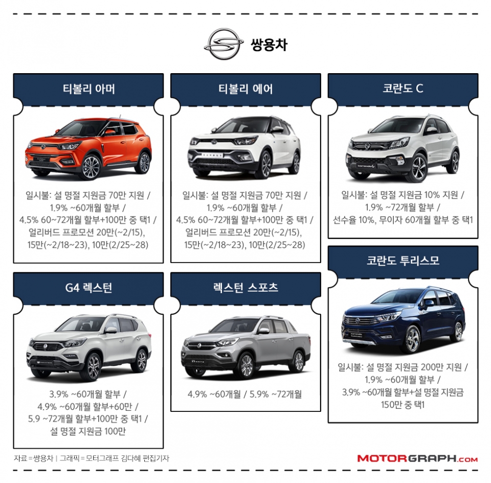 이외 티볼리 브랜드는 선수율 없이 5.9% 이율로 120개월 롱 플랜 할부 프로그램을 운영하고, 코란도 C는 무이자 60개월 할부(선수율 10%)가 지원된다.