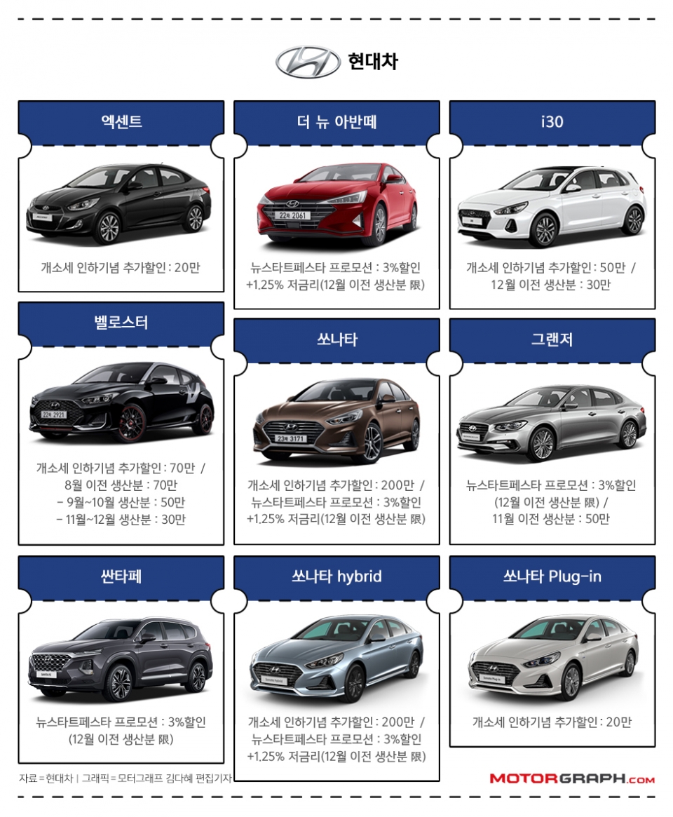 이어 ▲벨로스터 70만원 ▲i30 50만원 ▲엑센트 20만원 등 기본 할인이 적용된다. 아반떼·쏘나타·그랜저·싼타페 등은 15일 이전 출고시 20만원 혜택을 누릴 수 있다.