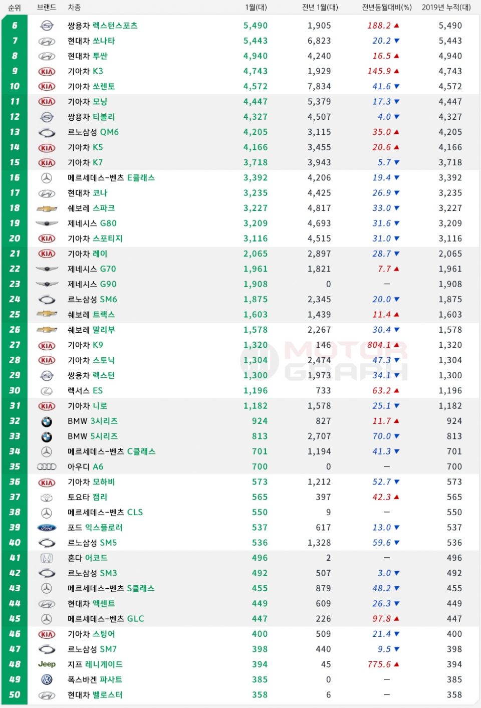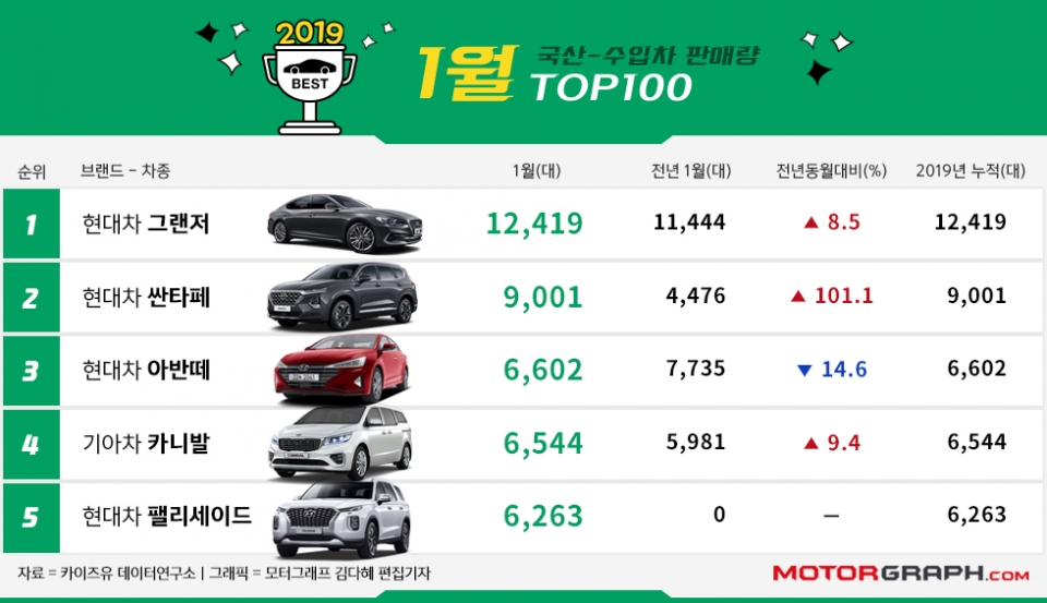 1월 완성차 시장은 그랜저와 싼타페가 맹위를 떨치는 가운데, 팰리세이드와 렉스턴 스포츠, 그리고 E클래스 등이 두각을 나타냈다.