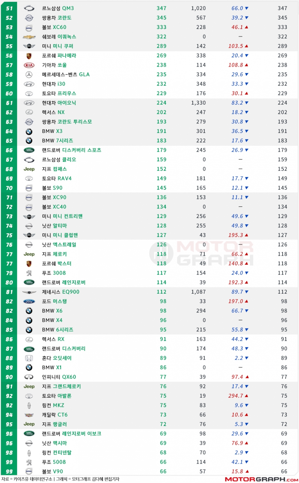수입차로는 메르세데스-벤츠 E클래스(3392대)가 가장 높은 순위(16위)를 차지했다. 더불어 렉서스 ES(1196대)도 월 1000대를 넘기며, 30위권에 포함됐다. 이들은 여느 국산차보다 높은 인기를 누리며 소비자들의 선택을 받았다.