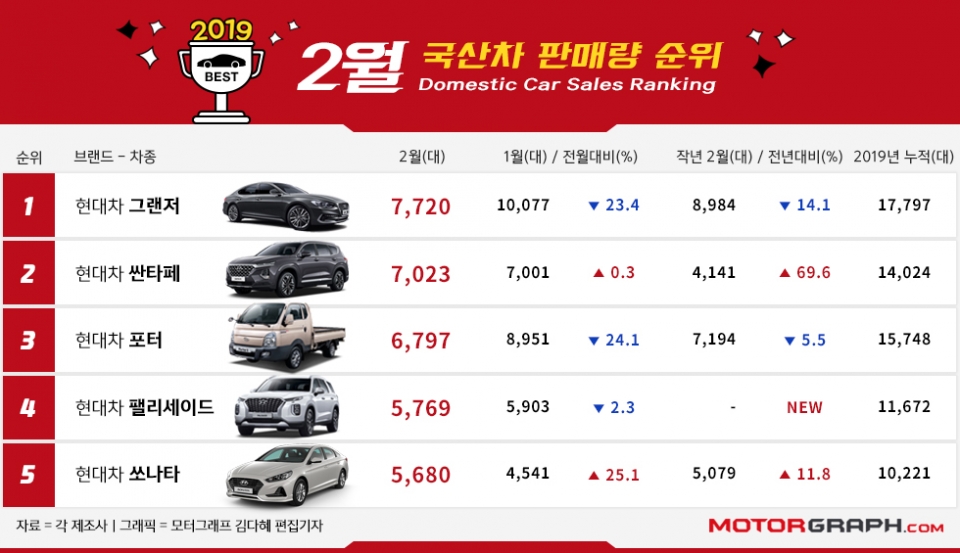 현대차는 지난달 4만9263대를 판매했다. 지난해 같은 기간에 비해 판매는 8.9% 높아졌다. 2월은 설 연휴로 인한 영업 일수 축소로 지난 1월에 비해서는 10.7% 판매가 줄었다. 현대차를 이끌던 그랜저의 판매가 7720대로 크게 줄었다. 싼타페, 팰리세이드 등은 꾸준한 판매를 기록 중이다. 현대차는 올해 2월까지 총 10만4429대를 판매했다. 지난해 같은 기간에 비해 판매는 15.7% 늘었다.