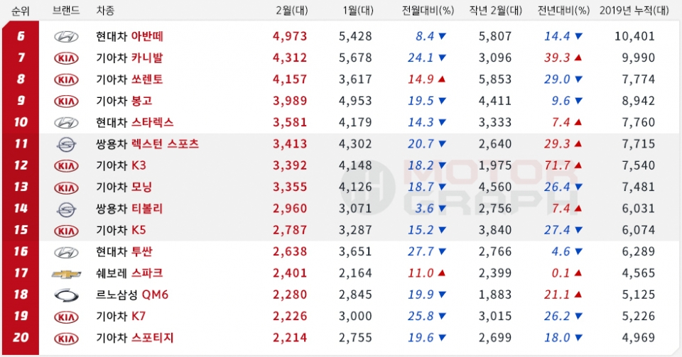 4일, 국산차 업체에 따르면 지난 2월 국산차 판매대수는 10만4307대로 집계됐다. 지난해 2월에 비해 판매는 약 1.1% 줄었다. 설날 연휴로 인한 영업 일수 축소와 일부 브랜드의 파업이 진행되면서 생산량과 판매량이 소폭 하락했다. 현대차와 쌍용차는 지난해 같은 기간에 비해 판매량이 크게 증가했고, 기아차, 한국GM, 르노삼성차, 제네시스 등의 판매는 줄었다. (버스 및 상용차 포함)