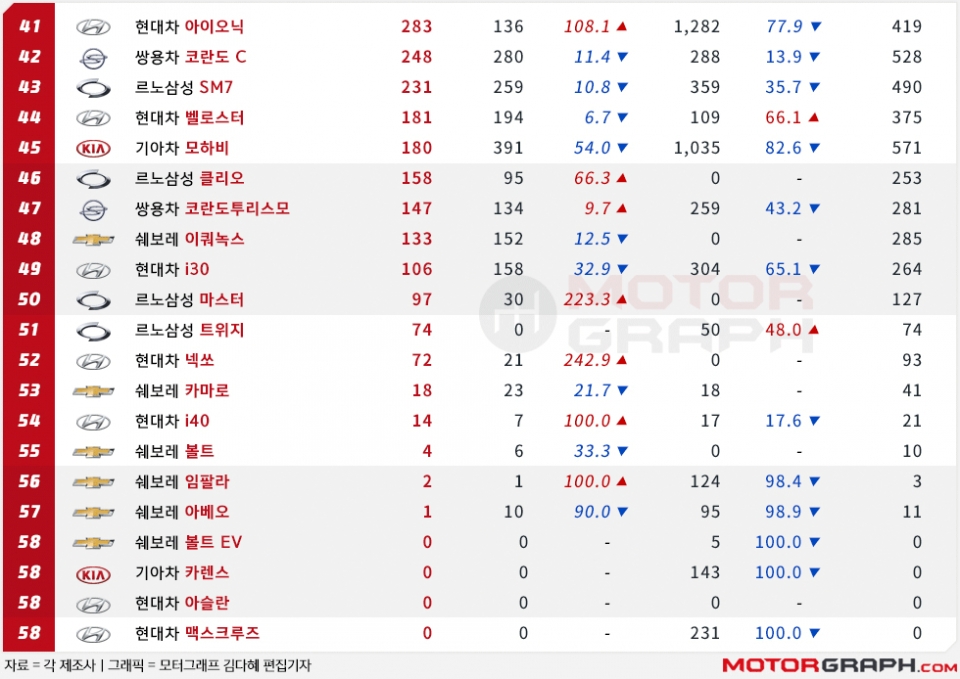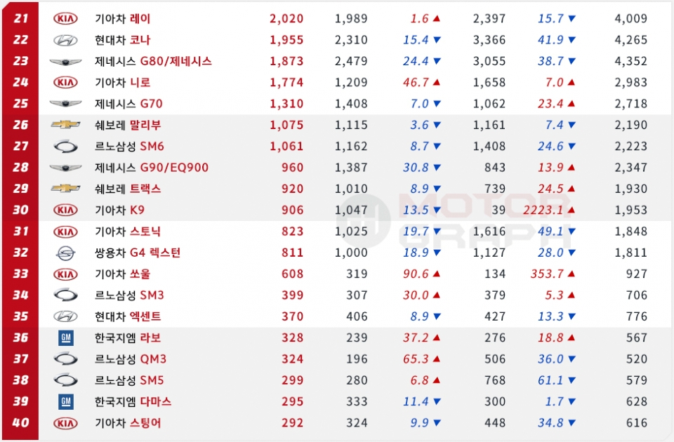 한국GM은 지난달 5177대를 팔았다. 한국GM은 지난 1월 제네시스 브랜드보다 적게 팔렸지만, 2월에는 판매가 소폭 상승했다. 한국GM은 “스파크, 트랙스, 이쿼녹스, 임팔라 등의 가격 재포지셔닝을 바탕으로 점진적인 판매 회복이 있을 것”이라고 전했다. 한국GM은 올해 2월까지 1만230대를 팔았다. 지난해 같은 기간에 비해 판매는 25% 줄었다.