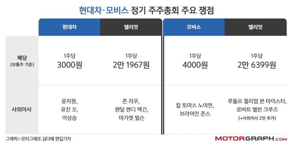 먼저, 현대차와 모비스는 지난달 이사회를 열고, 각각 1주당 3000원과 4000원의 배당금을 의결했다. 반면, 엘리엇은 현대차 1주당 2만1976원, 모비스 1주당 2만6399원 등 6.5~7.3배에 달하는 배당을 요구하고 나섰다(보통주 기준).