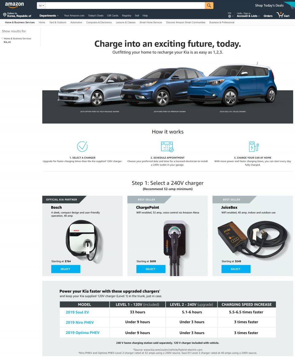 아마존은 홈페이지에 ‘Charge My KIA’ 페이지를 개설하고 레벨2 충전기 3종 판매를 시작했다. 충전기를 선택하고, 선호하는 설치 날짜와 시간을 정하면 허가받은 기술자가 방문해 충전기를 설치한다.