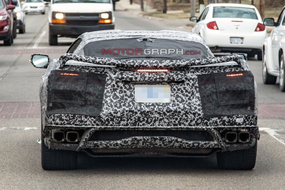 8세대 리어 스포일러는 안쪽으로 휘어지는 라인이 7세대보다 좀 더 깊고 낮아진 것이 특징이다. 또, 쿼드 머플러가 가운데 위치했던 7세대와 달리 듀얼 머플러가 적용된 모습도 눈에 띈다. 이에 따라 기존 후면 중앙에 크게 각인됐던 콜벳 로고가 작아질 것으로 예상된다.