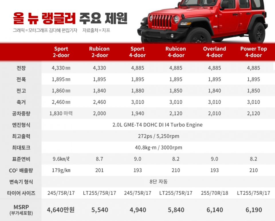 지프는 스포츠 및 루비콘 4도어 모델에 이어 새롭게 2도어 모델과 오버랜드, 루비콘 파워탑 등을 추가했다.