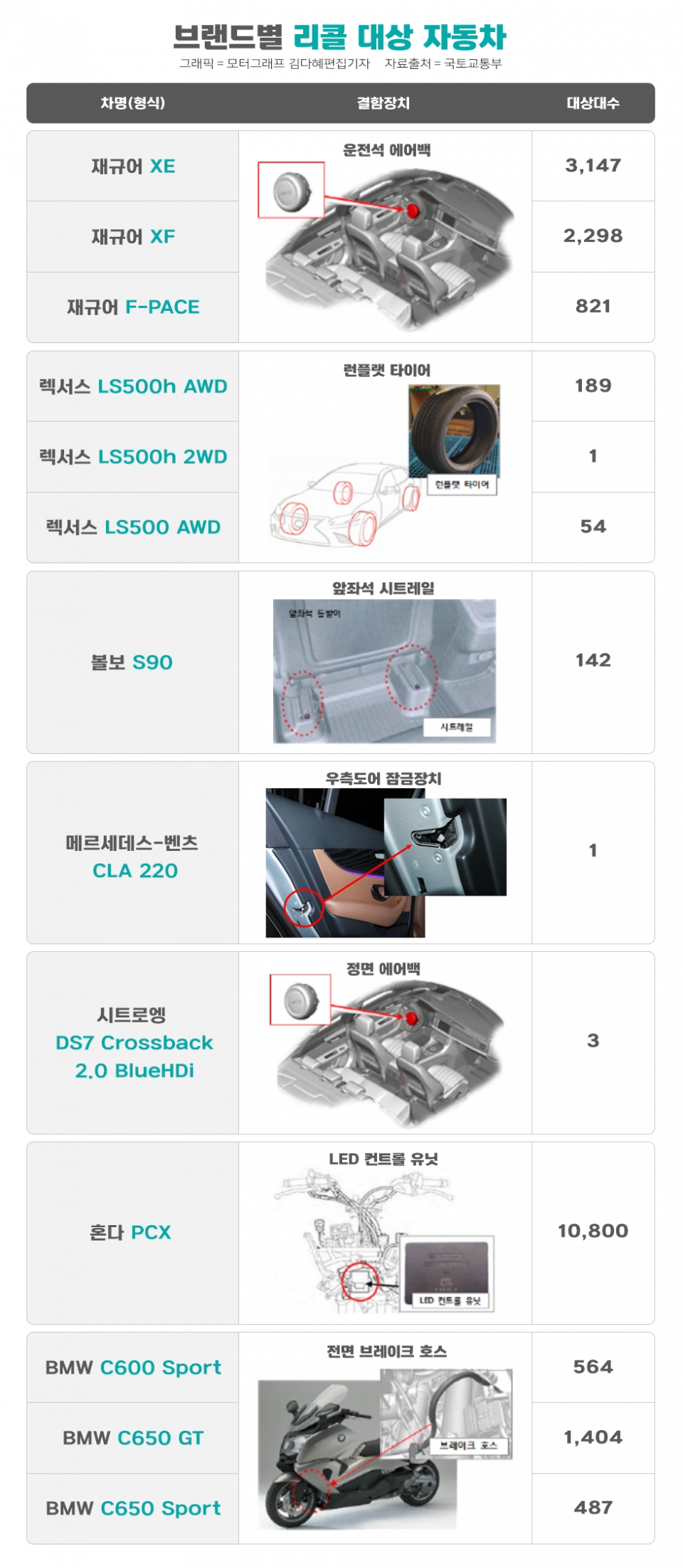 재규어랜드로버코리아는 타카타사에서 제조한 에어백에서 문제가 발견됐다. 대상 차종은 ▲2014년 12월~2016년 10월 생산 XE ▲2015년 5월~2016년 10월 생산 XF ▲2015년 12월~2016년 10월 생산 F-PACE 등 3종이다. 타카타사에서 공급한 운전석 에어백 모듈의 인플레이터가 고온다습한 상태에서 에어백 전개 시 내부 부품 금속 파편이 운전자 등에게 상해를 입힐 가능성이 확인됐다.