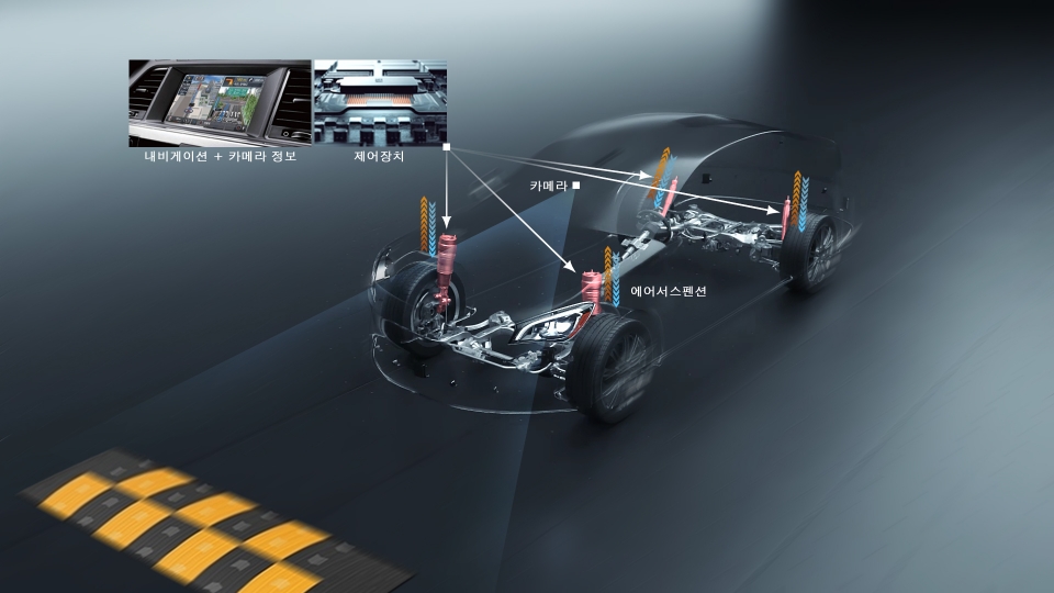 예를 들어 전방 어린이보호구역을 지나가야할 경우 차량 스스로 서서히 차체를 낮추고 서스펜션도 부드럽게 바꿔 승차감을 좋게 하는 방식이다. 스쿨존에서 차고를 낮추는 이유는 안전을 위한 시야 확보 차원이다. 이 기술을 활용하면 SUV 차량의 경우 최대 100mm까지 차고를 조절할 수 있다.