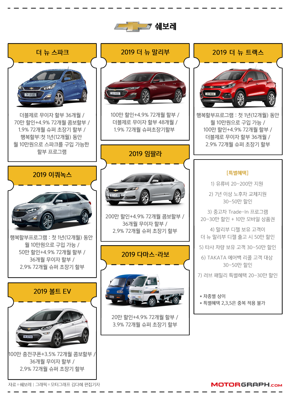 한국GM은 13세 이하 자녀 혹은 다자녀 양육 가정, 다문화 가정, 신혼부부를 대상으로 ‘러브패밀리 페스티벌’을 진행한다. 해당 고객은 스파크 구매 시 20만원, 말리부·트랙스·이쿼녹스 구매 시 30만원 추가 할인 혜택을 제공한다.