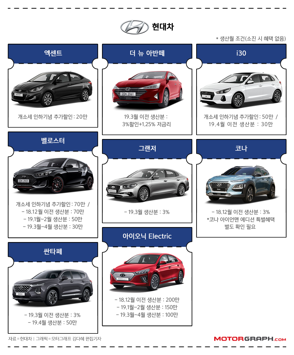 아이오닉 일렉트릭은 생산 시기에 따라 최대 200만원 할인을 제공한다. 더 뉴 아반떼는 3월 이전 생산분에 대해 3% 할인 및 1.25% 저금리 할부를 지원한다.