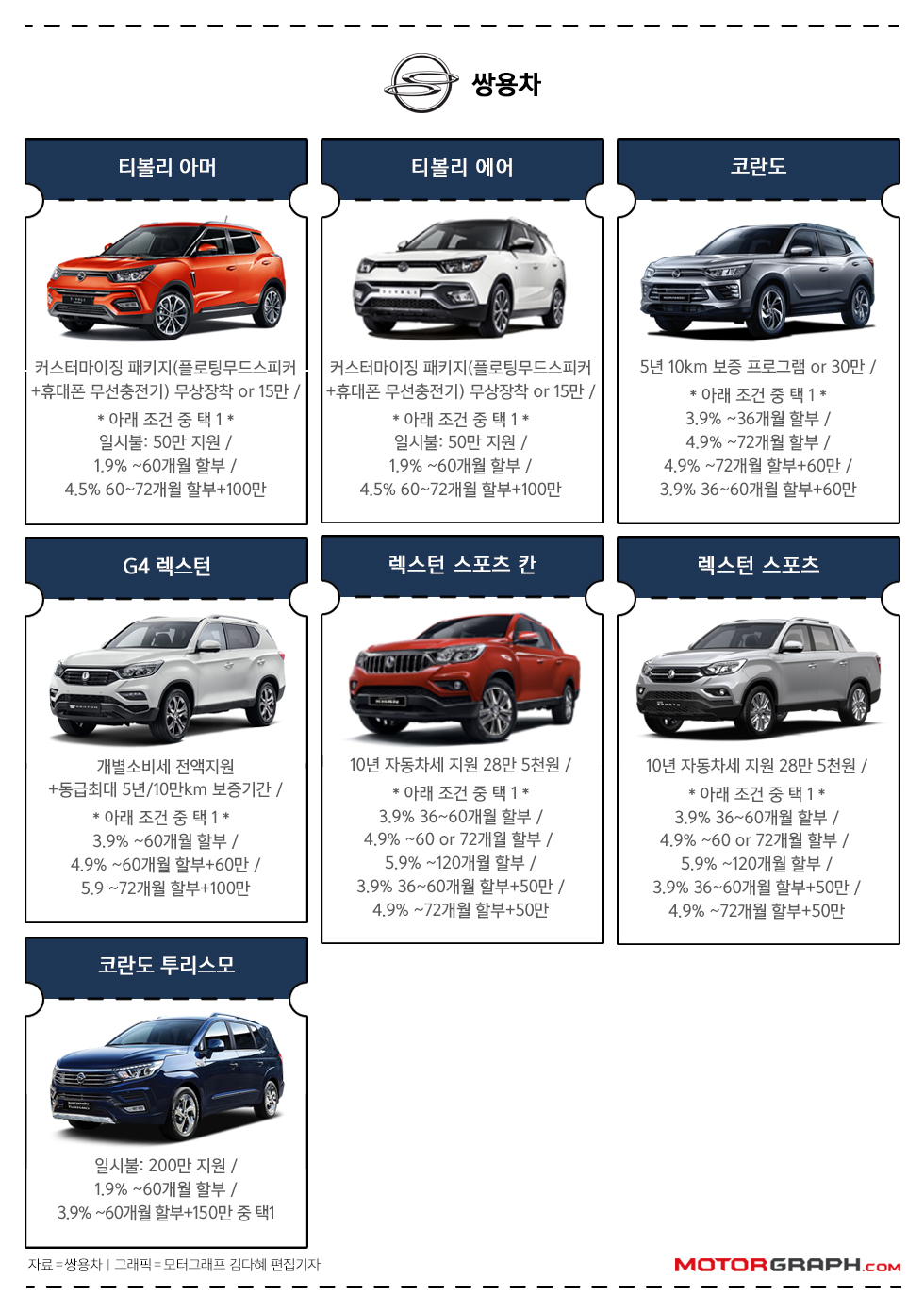 쌍용차 G4 렉스턴은 개별소비세 전액(3.5%)을 지원하며, 60만원(4.9% 할부 조건)에서 100만원(5.9% 할부 조건)의 가족여행 지원금이 제공된다.