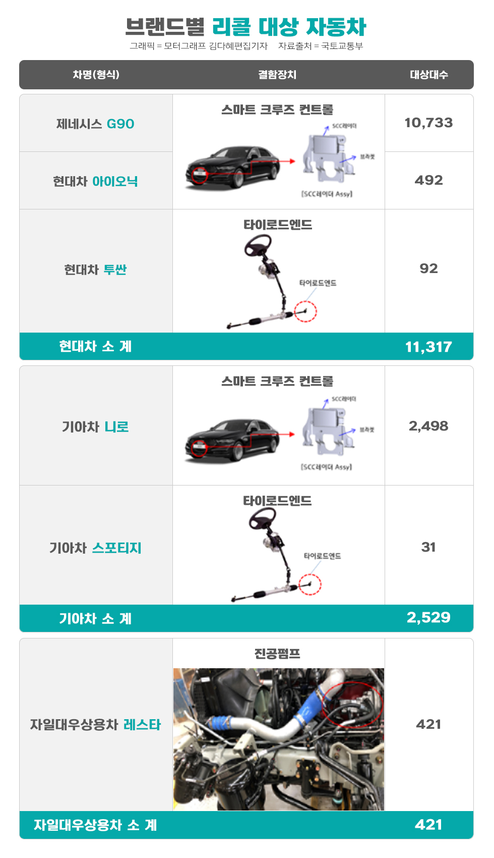 세부 차종으로는 현대차 2018년 10월~2019년 5월 제작 제네시스 G90 1만733대, 2019년 1월~5월 제작 아이오닉 492대, 2019년 5월 제작 투싼 92대, 기아차 2019년 3월~4월 제작 니로 2498대, 2019년 5월 제작 스포티지 31대, 자일대우상용차 2018년 9월~2019년 5월 제작 레스타 421대다.
