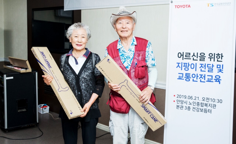 한국토요타가 지난 21일 경기도 안양시 노인종합복지관에서 교통안전교육을 실시하고, 고령자 보행 안전을 위한 LED 지팡이를 전달했다.