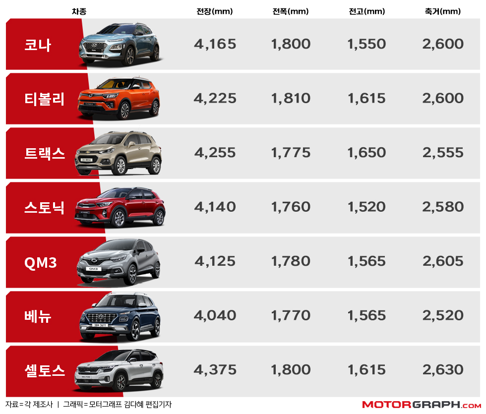 가장 작은차는 스토닉과 베뉴로 나타났다. 스토닉은 가장 짧은 전폭과 낮은 전고를, 베뉴는 가장 짧은 전장과 휠베이스를 가졌다.