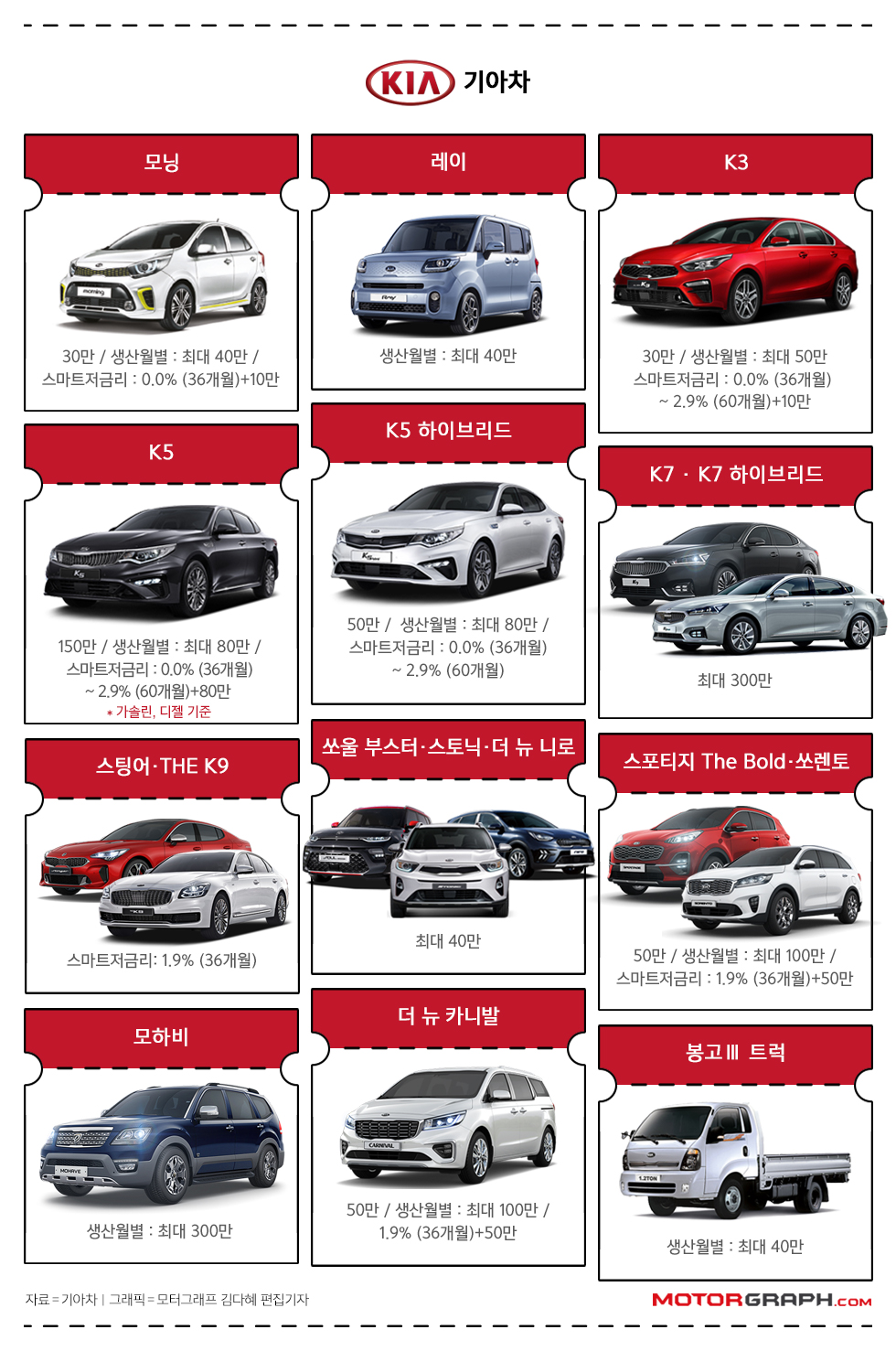 K5는 지난달보다 10만원 줄어든 150만원, K5 하이브리드는 20만원 줄어든 50만원, K3는 20만원 줄어든 30만원의 기본 할인을 제공한다. 구형 K7과 K7 하이브리드는 기본 할인이 없는 대신 생산 월별로 최대 300만원을 지원한다.