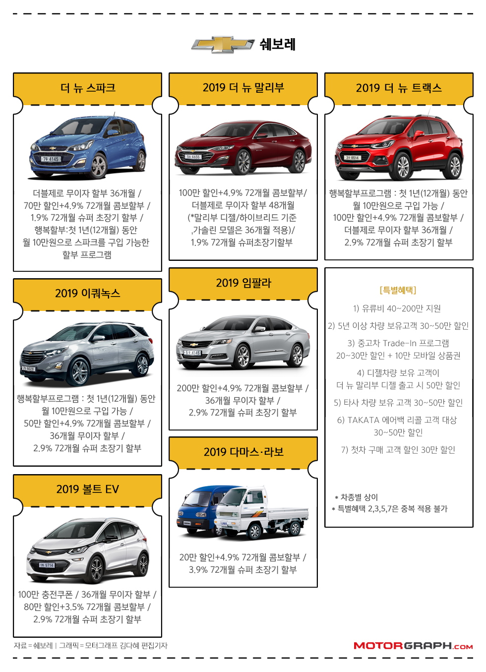 지난달에 이어 스파크, 말리부, 트랙스 구매 고객을 대상으로 선수금 및 이자가 없는 ‘더블 제로’ 할부 프로그램을 진행한다. 이에 따라 스파크, 트랙스, 말리부 가솔린 구매 고객은 최대 36개월, 말리부 디젤·하이브리드 고객은 최대 48개월까지 전액 무이자 할부가 가능하다.