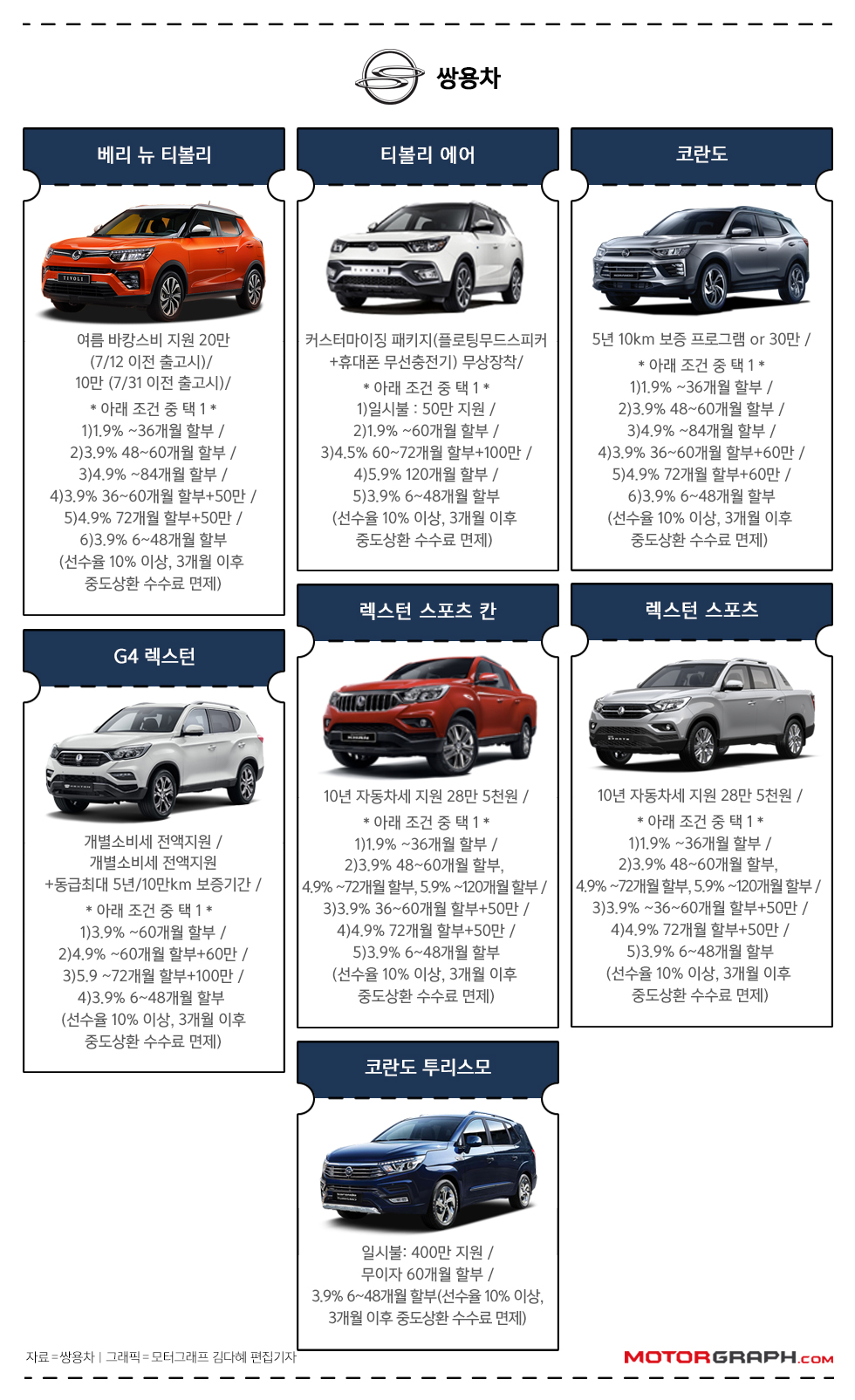G4 렉스턴은 개별소비세 전액(3.5%)을 지원하며 할부 기간에 따라 최대 100만원의 바캉스비를 지급한다. G4 렉스턴과 신형 코란도는 지난달에 이어 5년/10만km 동급 최장 보증 연장 서비스인 ‘워런티 프로미스 510’을 제공한다.
