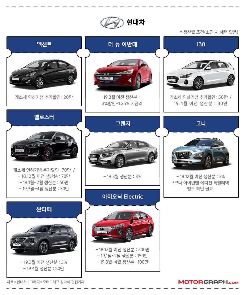 아이오닉 일렉트릭은 생산 월에 따라 최대 200만원 할인을 제공하고 아반떼는 3월 이전 생산분에 대해 3% 할인 및 1.25% 저금리 할부를 지원한다. 그랜저와 싼타페도 3월 이전 생산 차량을 구매할 경우 3% 할인을 제공한다. (4월 생산 싼타페는 50만원 할인) 코나는 지난해 12월 이전 생산분 3% 할인을 제공한다.
