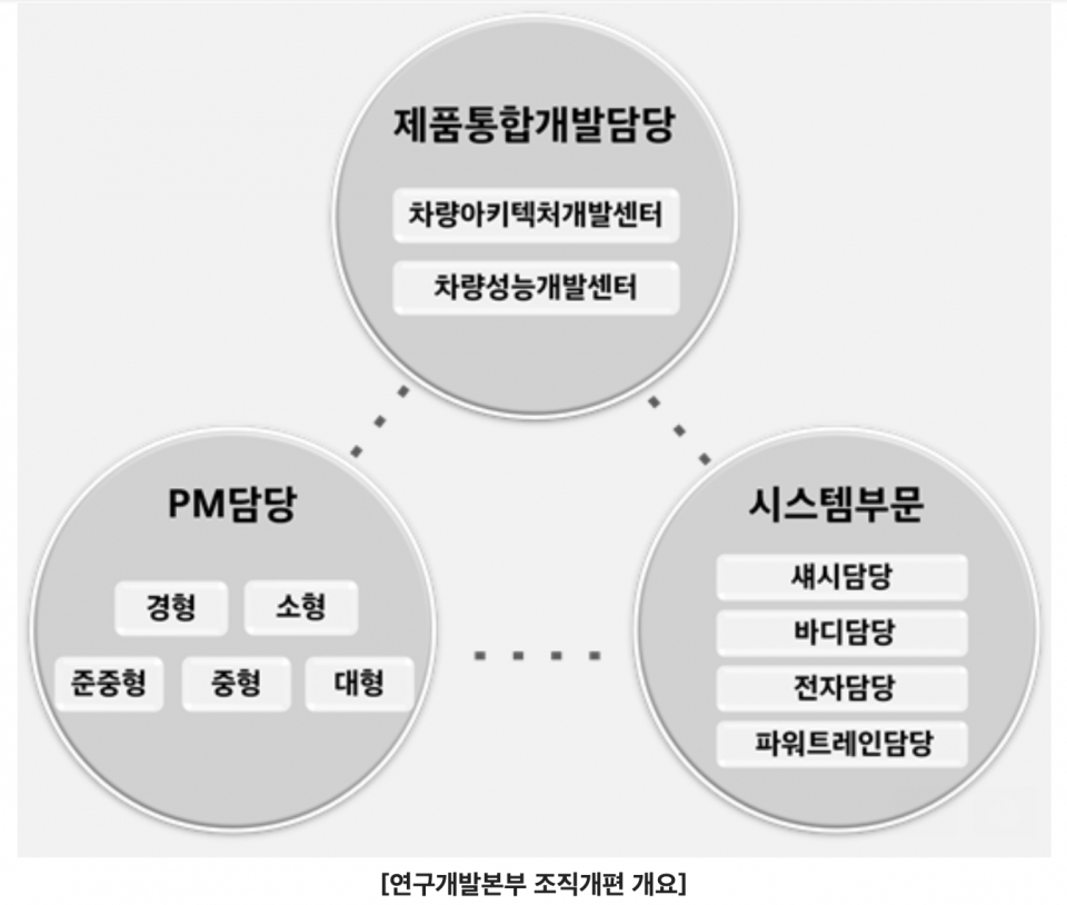 제품개발을 총괄하는 PM담당은 앞선 제품통합개발담당에서 만들어진 차량의 기본 콘셉트를 바탕으로 차량의 각 시스템 부문에서 개발한 기술을 차급과 브랜드별로 최적화해 상호 간섭을 막고 차별화된 제품 개발을 책임진다. 기존의 브랜드와 차급 개념이 섞인 ‘혼합 구조(제네시스, EV고성능, 소형, 중대형, RV)’에서 전 브랜드를 아우르는 ‘차급 구조(경형, 소형, 준중형, 중형, 대형 센터)’로 개편됐다.