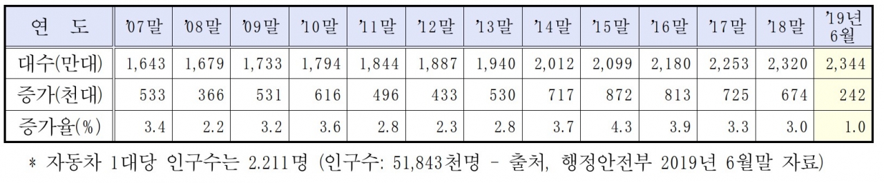 국토교통부가 운영하는 자동차관리정보시스템(VMIS)에 따르면, 2019년 6월 말 현재 자동차 누적 등록 대수가 2344만4165대로 집계됐다. 이는 지난해 말에 비해 약 1.0%(24만대) 가량 증가한 수치다.