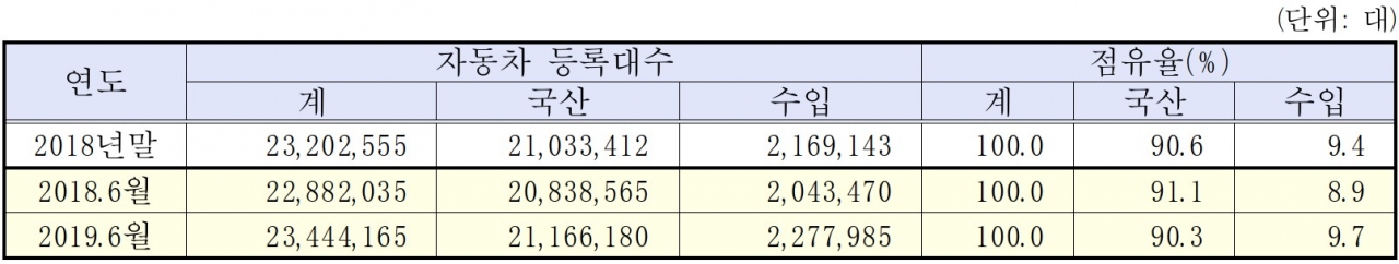 세부적으로는 국산차가 90.3%(2117만대), 수입차가 9.7%(228만대)를 차지했다. 수입차 점유율은 지난해 6월 말 8.9%를 기록보다 증가한 것으로 나타났다.