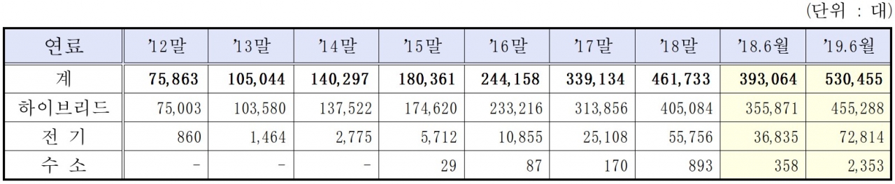 전기, 하이브리드, 수소연료전지차 등 친환경차는 53만대로 전체에서 차지하는 비중이 1.7%에서 2.3%로 늘어났다. 국토부는 미세먼지 감축을 위한 정부의 친환경차 보급 확대와 고연비에 대한 국민들의 높은 관심, 기존 차량 외 전기차를 동시에 등록한 소유자 증가 등을 볼 때 올해 말 친환경차 등록 대수가 60만대를 넘어설 것으로 전망했다.