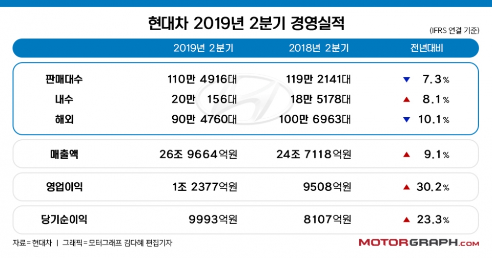 현대차 관계자는 실적과 관련해 “지난 2분기는 글로벌 무역 갈등 지속과 경기 둔화 우려 등으로 주요 시장의 수요가 침체되며 어려운 여건이 계속됐다”며 “이러한 가운데에서도 원화 약세 등 우호적 환율 환경이 지속되었으며, 여기에 팰리세이드 등 고객 요구에 부합하는 SUV의 판매 증가에 따른 제품 믹스 개선, 쏘나타 신차 효과 등이 더해지며 2분기 수익성이 전년 동기대비 좋아졌다”고 설명했다.
