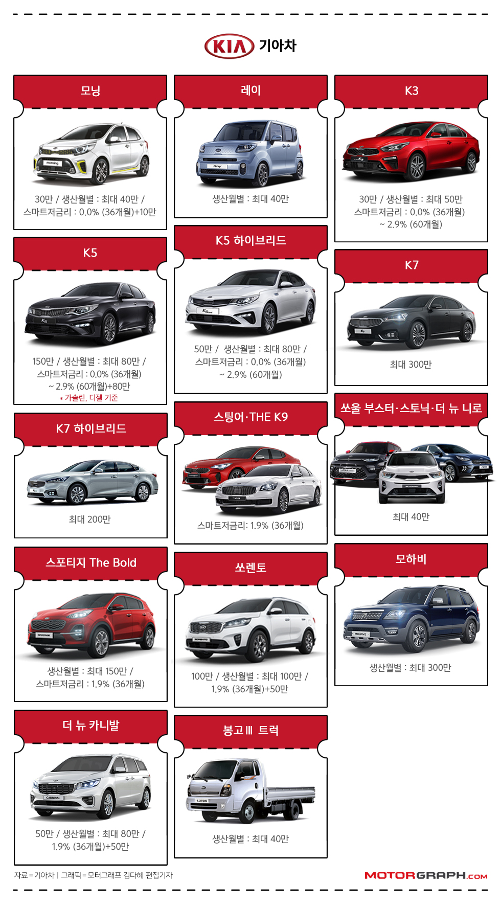 이 밖에 모닝은 36개월 무이자 할부를, K3·K5·K5 하이브리드는 36개월 무이자 혹은 60개월 2.9% 저금리 할부를, 스포티지·쏘렌토·카니발·스팅어·K9은 1.9% 36개월 저금리 할부를 제공한다.
