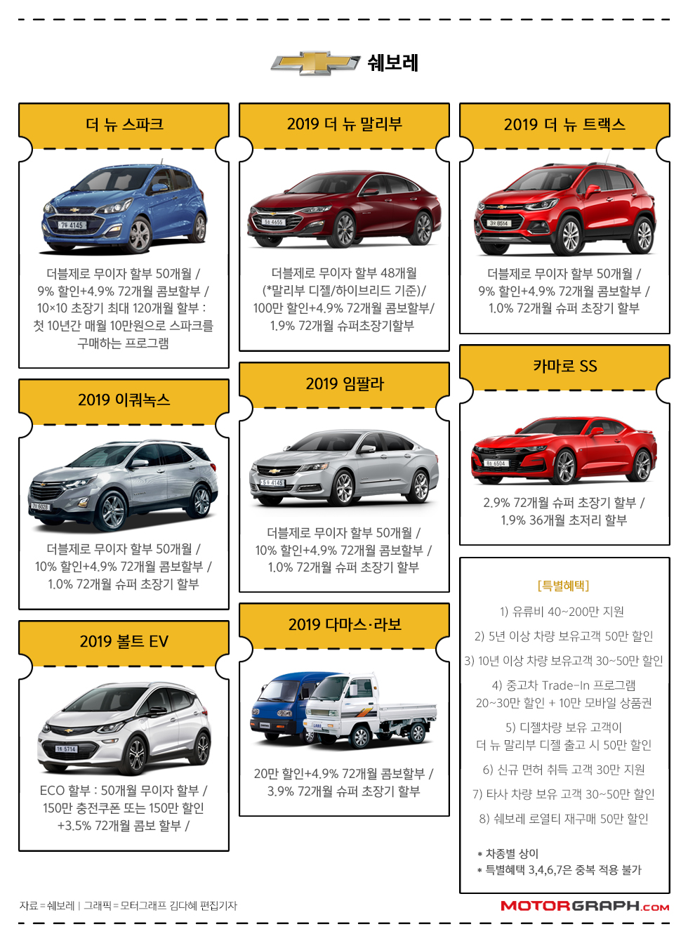 대상 차종은 쉐보레 스파크·트랙스·임팔라·이쿼녹스 등이며 5000대 한정으로 무이자 할부 50개월 혹은 4.9% 72개월 할부+최대 10% 할인을 제공한다.