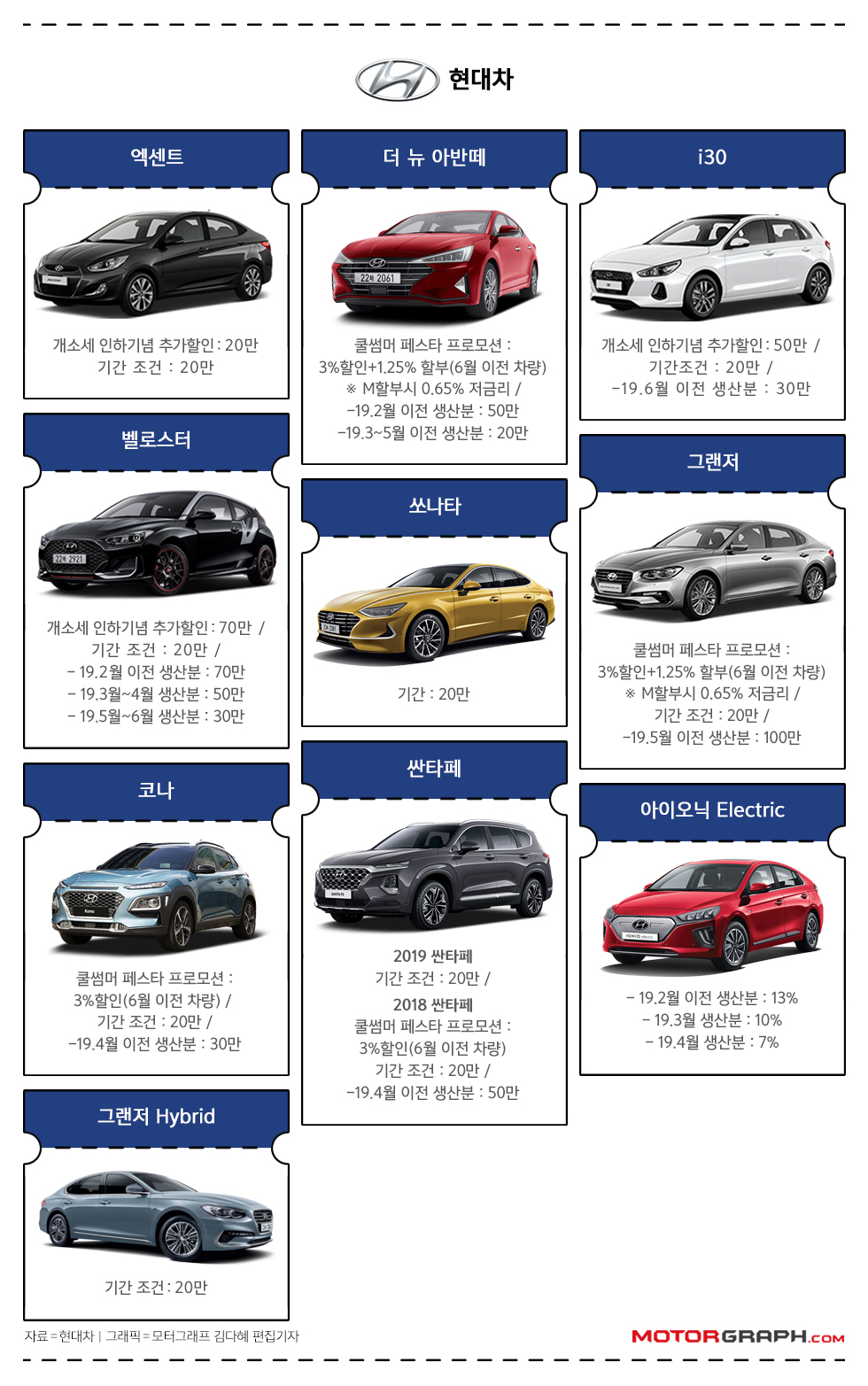 또한, 엑센트·아반떼·i30·벨로스터·쏘나타·그랜저·그랜저 하이브리드·코나·2019 싼타페 등을 대상으로 이달 31일까지 출고를 마칠 경우 20만원을 할인해주는 기간 조건 할인도 진행한다.