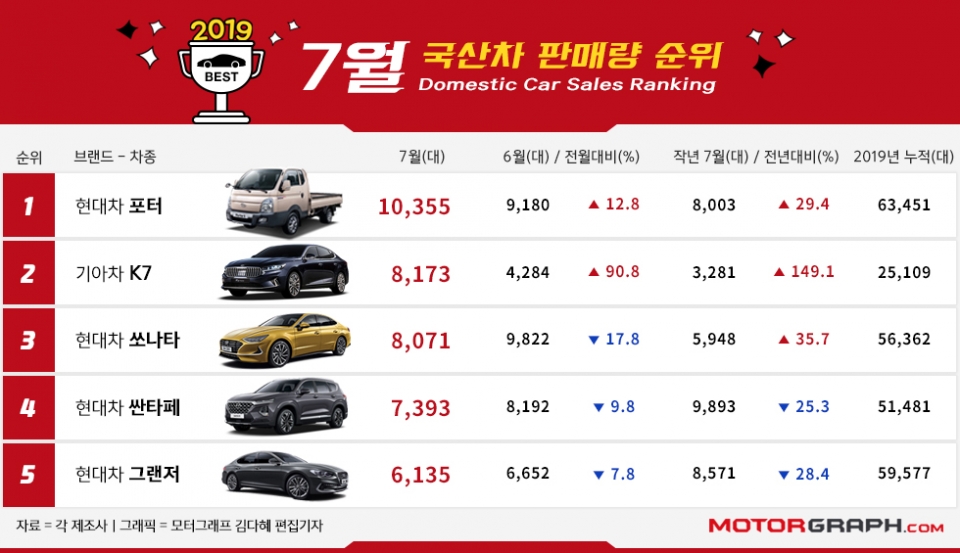 포터가 1만355대로, 7월 가장 높은 판매 실적을 달성했다. 포터가 월별 베스트셀링카에 등극한 것은 2016년 11월 이후 2년 7개월 만이다.