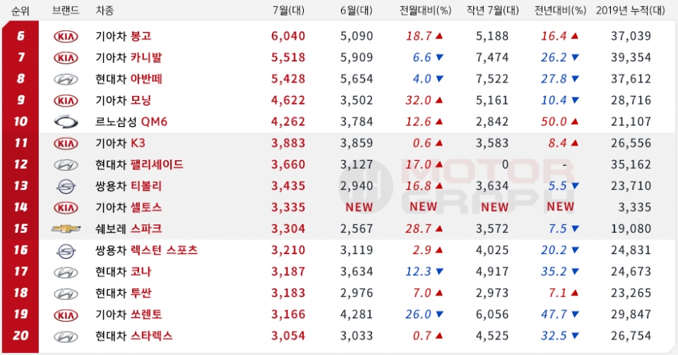 브랜드별로 쌍용차와 한국GM은 작년 7월보다 두 자릿수 감소세를 보였고, 현대기아차도 제자리걸음에 그쳤다. 여름 휴가철을 앞두고 르노삼성만 웃음을 지었다.