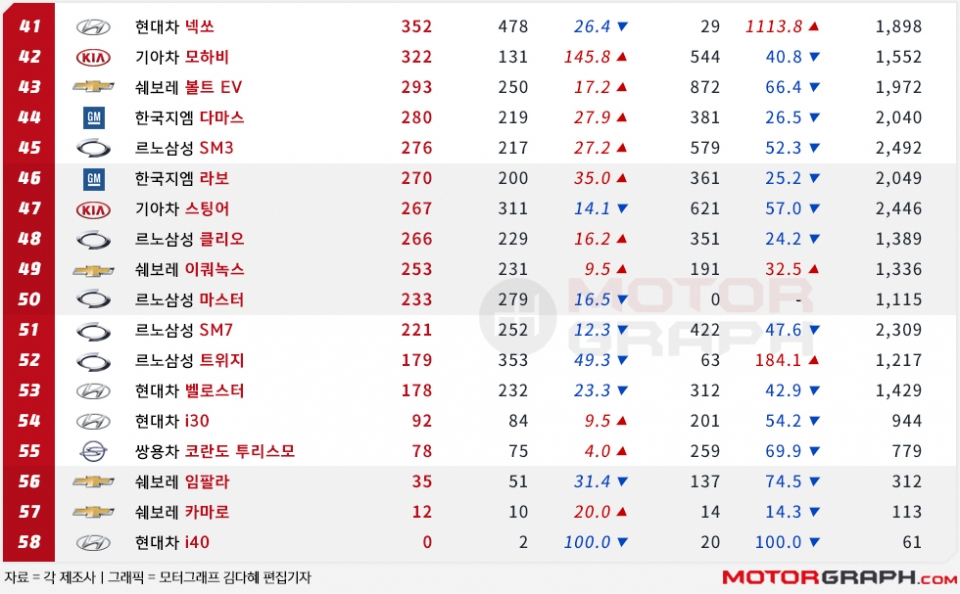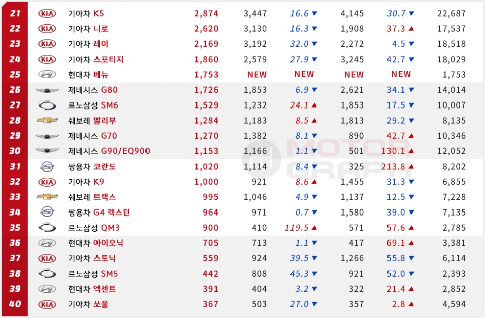 올해 1월부터 4월까지 월평균 6000대 이상 판매됐던 팰리세이드도 5월부터 최근 3개월 간 월평균 3000대 수준으로 떨어졌다. 새롭게 투입된 베뉴(1753대)의 신차효과도 제한적이다.