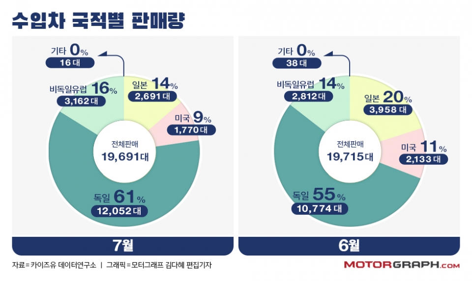 해당 기간 수입차 전체 판매량은 0.1%만 떨어졌다(6월 1만9715대→7월 1만9691대). 결국, 일본차만 눈에 띄게 판매량이 줄어든 점을 고려하면 불매운동이 영향을 미쳤다는 분석이다.