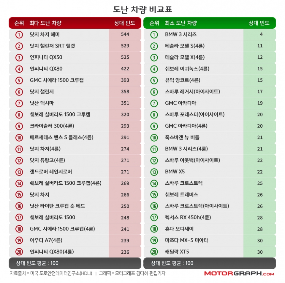 도난 사고가 가장 많이 발생한 차량은 FCA의 닷지 차저 헤미가 차지했다. 상대 빈도 수치는 544로, 일반 차량보다 5.4배 이상 높은 도난율을 기록했다. 닷지 챌린저, 닷지 차저, 닷지 듀랑고 등도 도난율이 높았다.