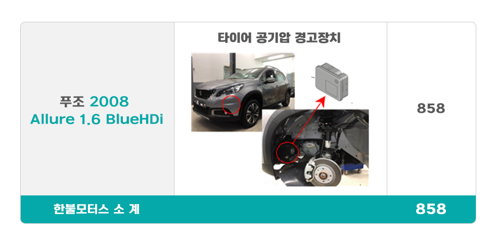 한불모터스는 수입·판매한 푸조 2008 알루어 1.6 BlueHDi 858대(2016년 9월~2018년 3월 생산)에서 타이어 공기압 경고 장치 결함이 발견됐다. 해당 차량은 타이어 공기압 경고 장치의 임계 값이 높게 설정되어, 공기압이 낮아져도 경고등이 점등되지 않는 문제점이 발견됐다.