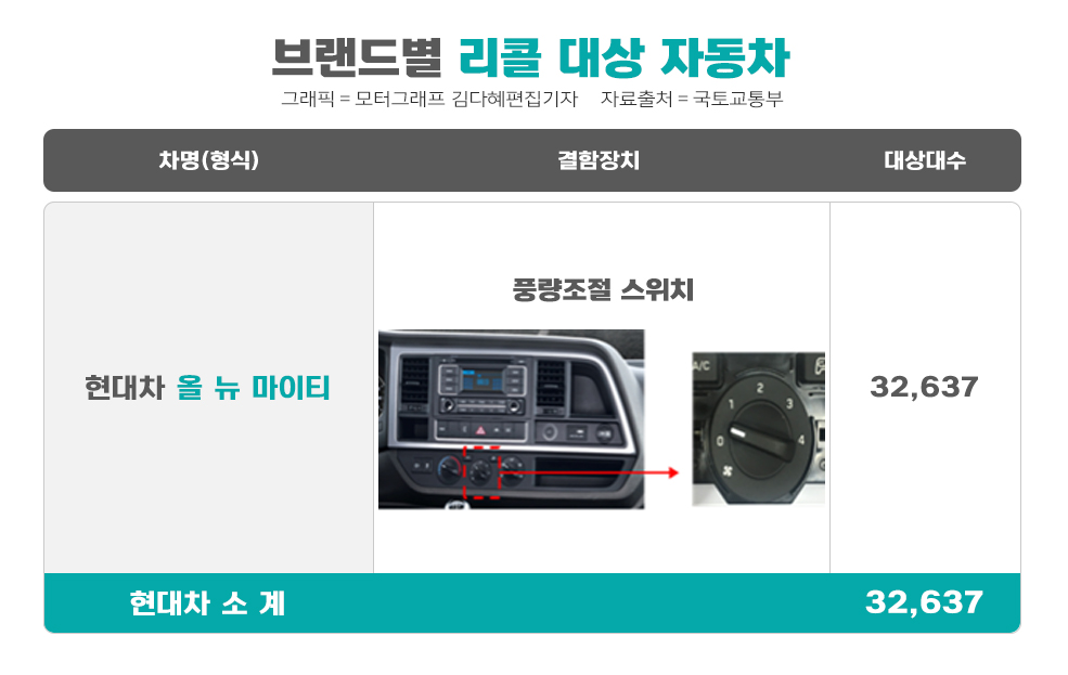 먼저, 현대차가 판매한 올 뉴 마이티 3만2637대(2015년 1월~2019년 3월 생산)에서 풍량 조절 스위치 결함이 발견됐다. 해당 차량은 풍량 조절 스위치 내부 단자에 금속 가루가 쌓여 오작동하거나 과열로 인해 화재가 발생할 가능성이 발견됐다.