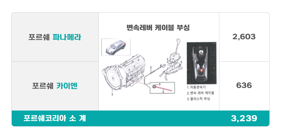 포르쉐코리아는 2008년 8월~2016년 9월 생산 파나메라 2603대, 2002년 7월~2010년 2월 생산 카이엔 636대 등에서 변속레버 케이블 부싱에서 결함이 발견됐다.