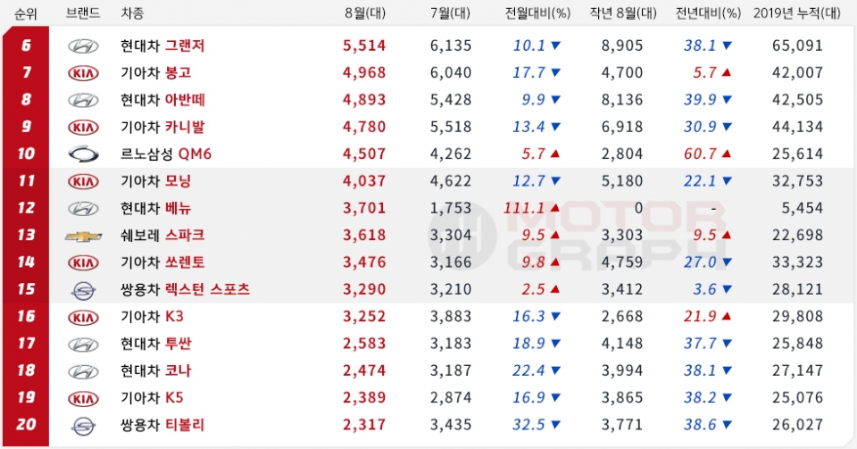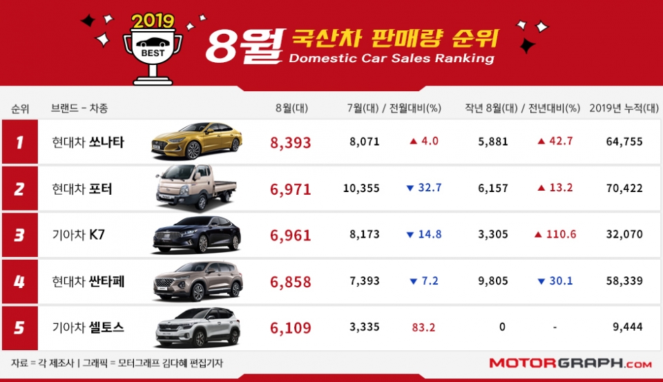 기아차는 K7(6961대)과 셀토스(6109대)의 신차효과가 톡톡히 발휘됐다. K7은 지난 7월에 이어 8월까지 두 달 연속 그랜저를 앞질렀다. 그랜저보다 K7 판매량이 많았던 것은 2016년 10월 이후 무려 2년8개월 만이다.