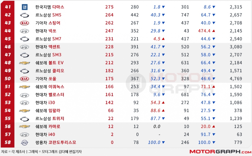 그러나 주력인 티볼리가 전년대비 38.6% 급감한 2317대에 그쳤다. 기아차 셀토스의 등장에 가장 큰 피해를 입었다.