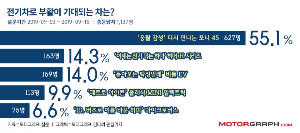 ‘클래식 Mini 일렉트릭’은 전체 응답자 중 9.9%인 113명이 지지했다. MINI 브랜드는 올해 서울모터쇼에서 클래식 Mini 일렉트릭를 전시한 데 이어 프랑크푸르트 모터쇼에서는 브랜드 최초 양산 전기차 ‘뉴 MINI 쿠퍼 SE’를 공개했다.