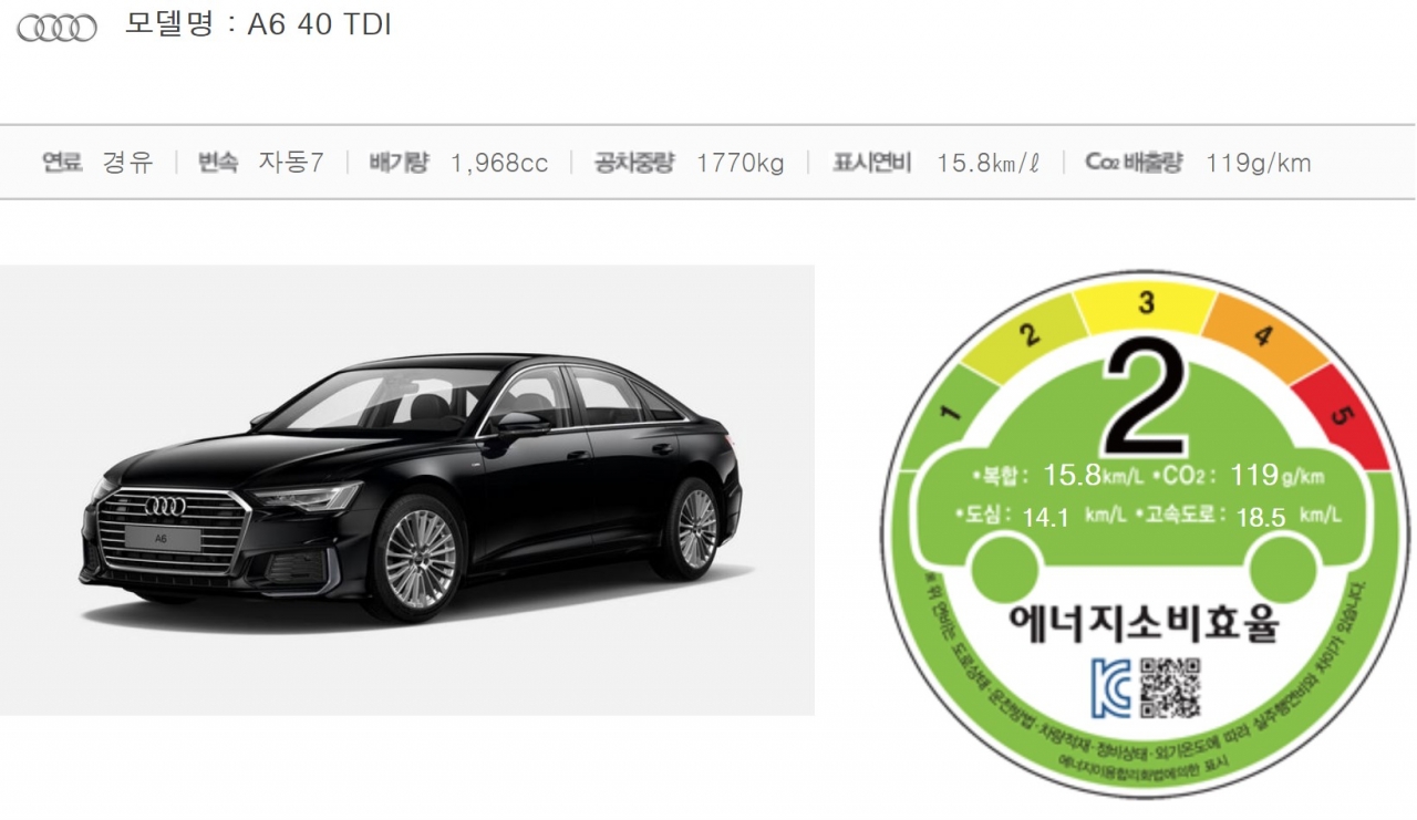 17일 한국에너지공단에 따르면 A6 40 TDI 모델의 복합 연비는 15.8km/L(도심 14.1km/L, 고속도로 18.5km/L)로 책정됐다.