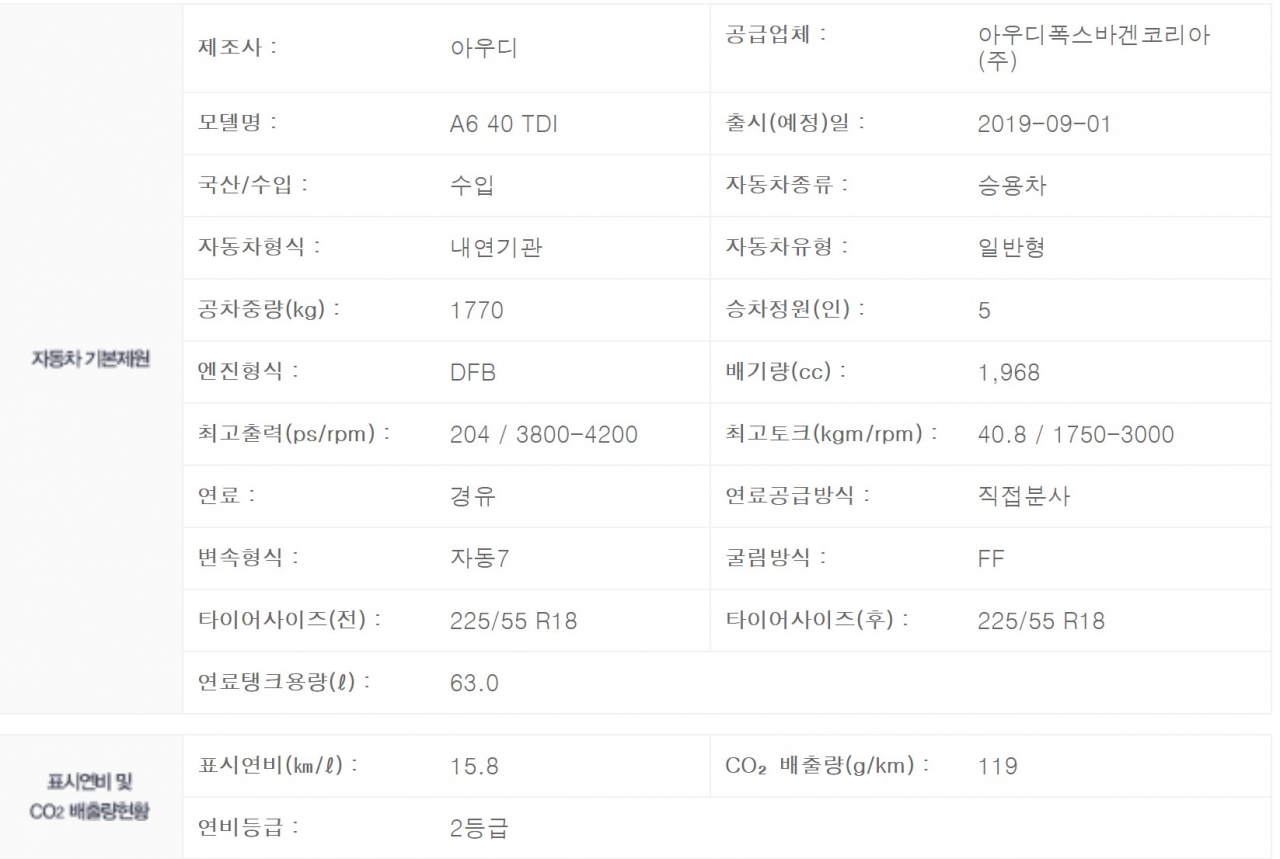 A6 40 TDI는 2.0L 4기통 디젤엔진과 7단 자동변속기의 조합으로, 최고출력 204마력, 최대토크 40.8kg·m의 성능을 발휘한다. 다만, 이번에 인증 받은 모델은 전륜구동이며 콰트로 시스템이 적용되지 않았다.